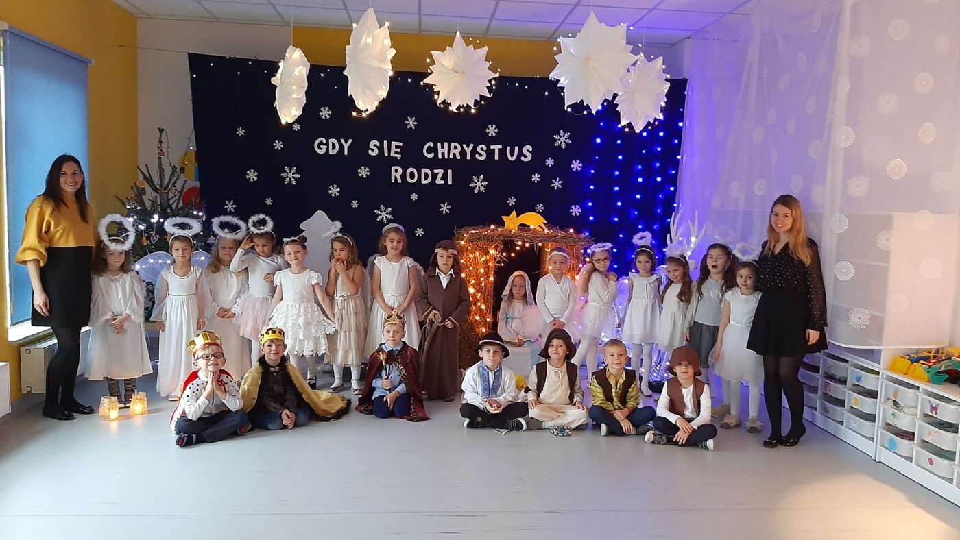 Tradycyjne bożonarodzeniowe jasełka przedstawiły dzieci z grupy Pszczółki. Wyjątkowa, świąteczna atmosfera otoczyła nas wszystkich. Mali artyści zaprosili swoich kolegów, koleżanki oraz Panie do Betlejem. Dzieci śpiewały piękne kolędy, grały na instrumentach oraz zaprezentowały umiejętności taneczne. W magicznym klimacie świąt składaliśmy sobie życzenia a następnie zasiedliśmy do wspólnej uroczystej wigilii.